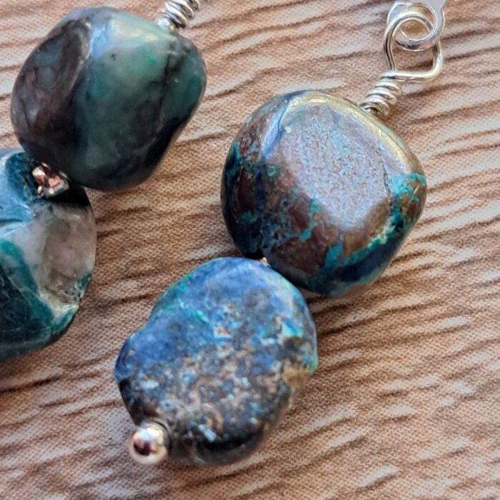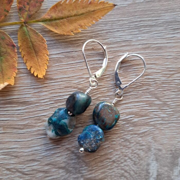 Kõrvarõngaste valmistamisel on kasutatud 8 – 10 mm suuruseid krüsokolla kivisid, 0,6 mm hõbtraati. Haagid hõbedast 925 prooviga.